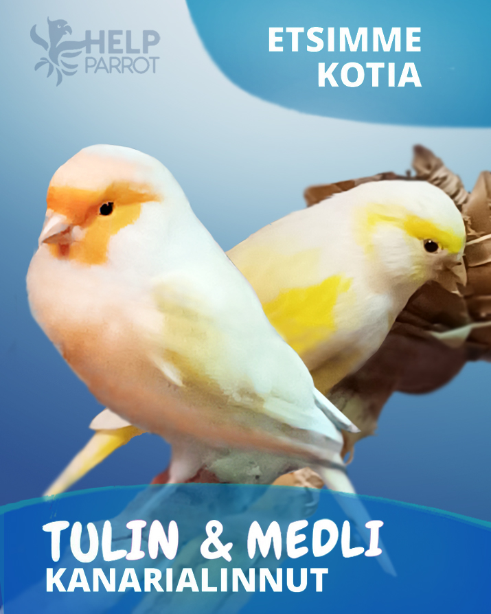Pirteät pikku kanarialinnut Tulin ja Medli etsivät kotia. Tulin on kauniisti laulava ja koiraaksi arvioitu. Vaikka linnut ovat pariskunta, he ovat olleet hyvin maltillisia pesinnän suhteen, eivätkä siis koittaneet rakennella pesää. - Toki tätä maltillista linjaa kannattaa kannustaa jatkossakin ja välttää lintujen pesintään innostavia tekijöitä tai virikkeitä.